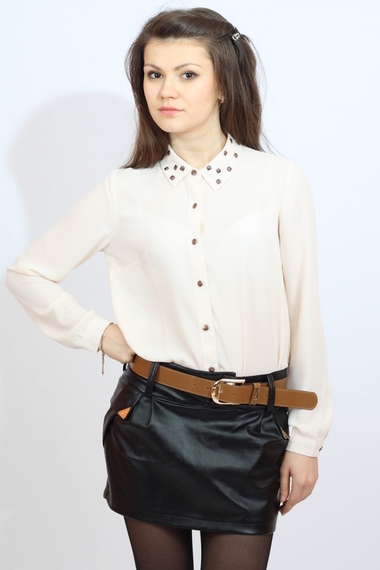 ОписаниеБлузка кремового цвета с длинными рукавами и классическим рубашечным воротником, украшенным крупными заклепками. Выполнена из тонкой шифоновой ткани.